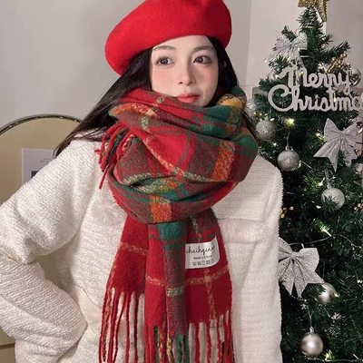 2026新年围巾绿色围巾女冬季高级感氛围格子围脖红色礼物ak19.9元淘宝69.9元