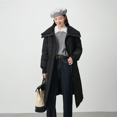 艾莱依时尚仿羊羔毛领长款羽绒服