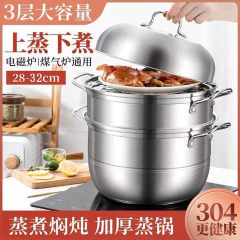 蒸锅304不锈钢三层加厚大号蒸笼馒头家用双层笼屉电磁炉煤气灶用